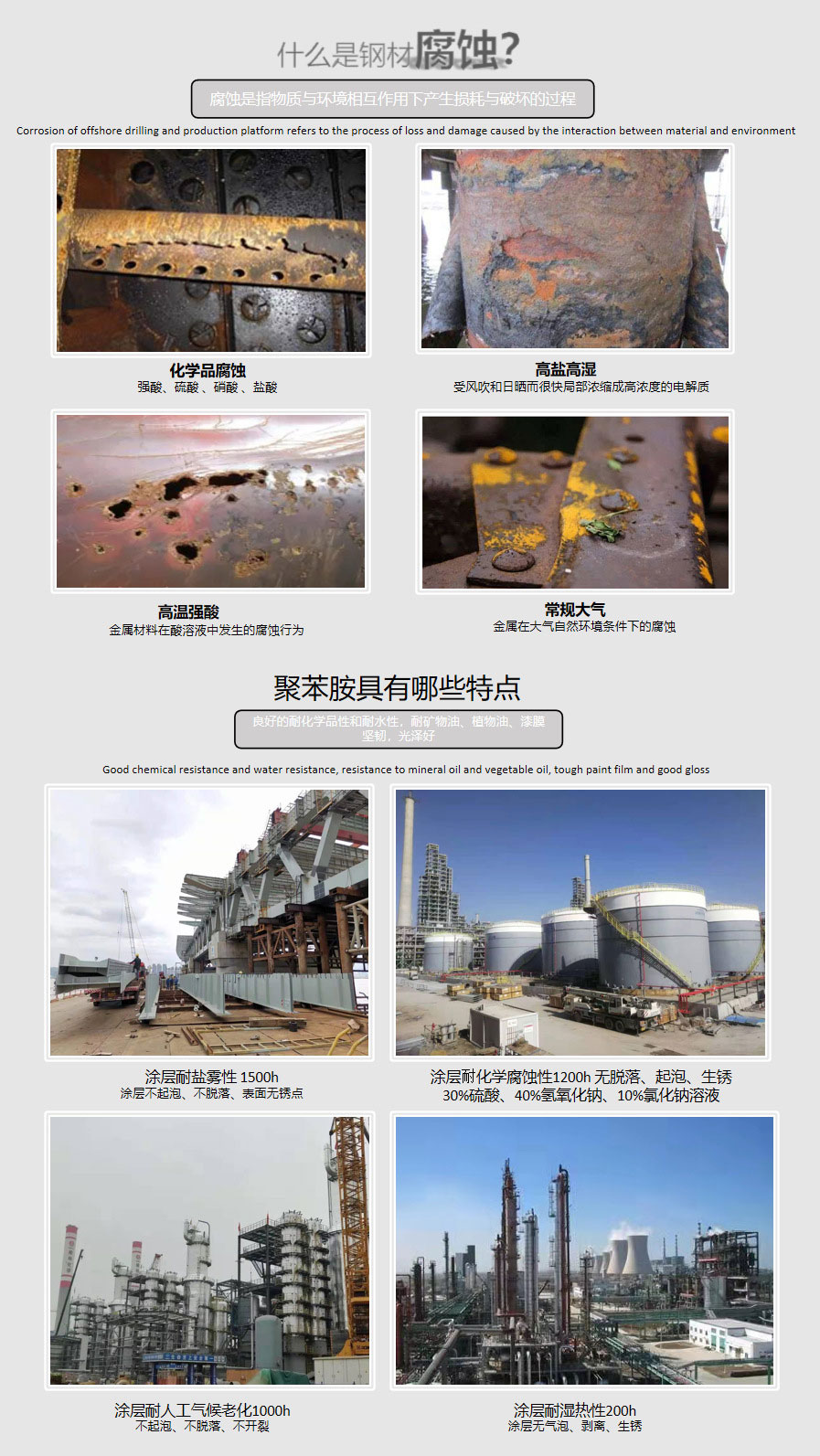 無溶劑環(huán)氧/聚氨酯體系,致密涂膜,耐酸、堿、鹽、油等化學介質(zhì)。