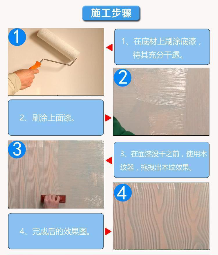 4、可呈現(xiàn)各種木紋狀藝術圖案,圖案隨意、細膩、無接縫、不起皮、不開裂,底色和面色可以自由搭配,圖案可任意創(chuàng)作。古色古香,壽命長;