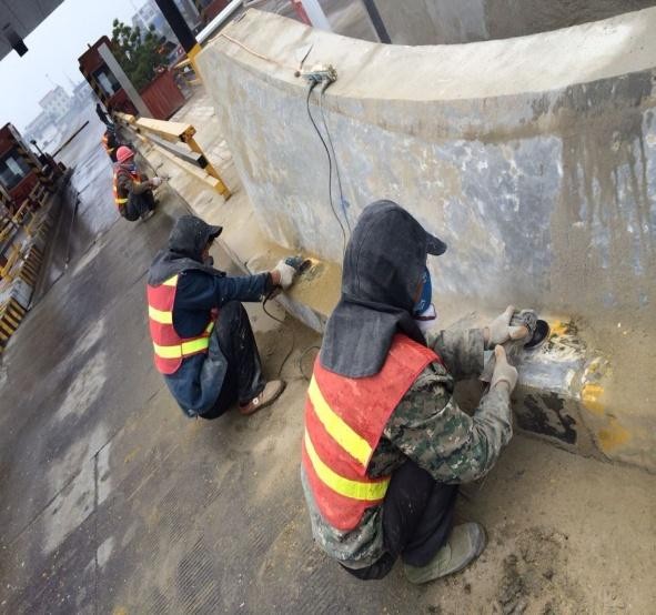 第一道工序:打磨混凝土表面,護欄表面清理干凈至新鮮混凝土面。將混凝土表面腐蝕掉的、不平整的部分打磨干凈。